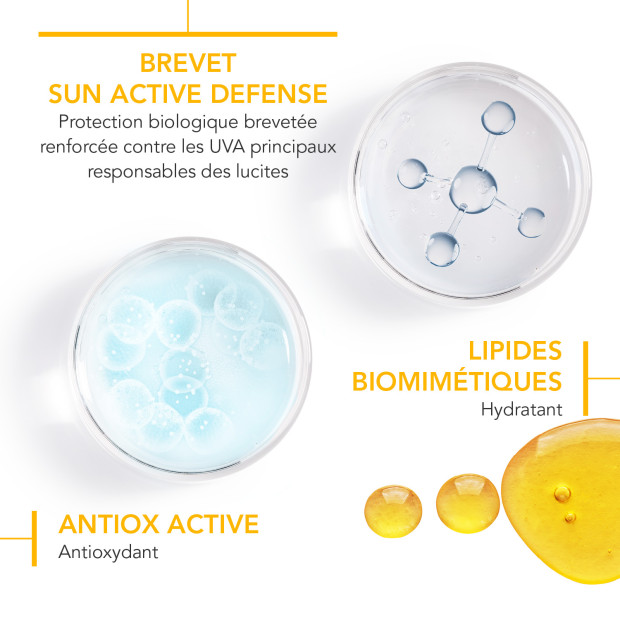 Sa formule inclut le Sun Active Defense, haute technologie de protection solaire brevetée, renforcée dans les UVA. Il associe des filtres UV et une protection biologique qui améliore les capacités d’auto-défense de la peau pour aider à préserver sa santé au soleil, durablement.