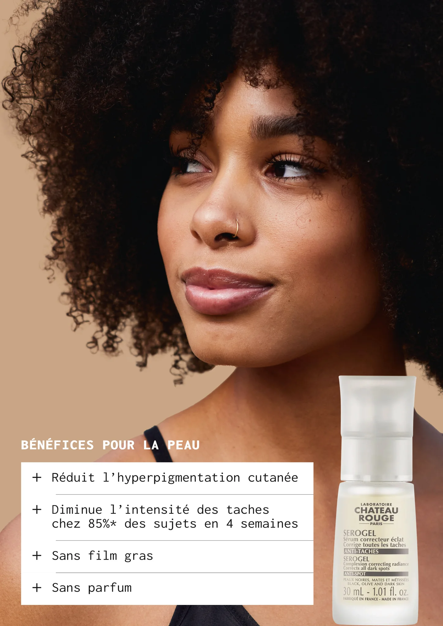 Ce soin anti-taches est parfaitement adapté aux peaux noires, mates et métissées : 100% des sujets satisfaits
