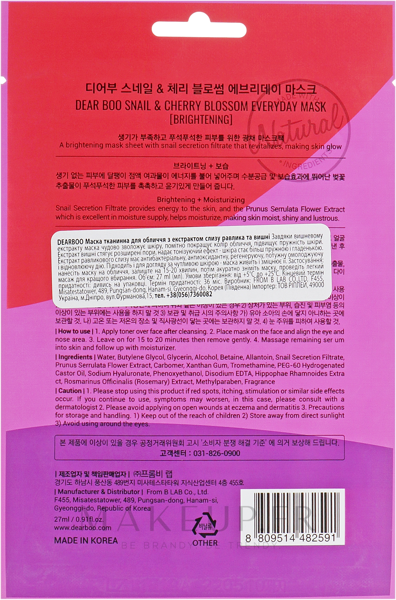 Caractéristiques du Masque Quotidien Dearboo Snail & Cherry Blossom :