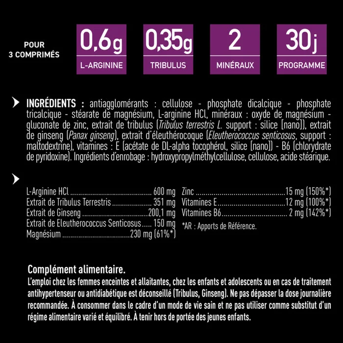 Ingrédients : antiagglomérants : cellulose – phosphate dicalcique – phosphate tricalcique – stéarate de magnésium, L-arginine HCl, minéraux : oxyde de magnésium – gluconate de zinc, extrait de tribulus (Tribulus terrestris L.), extrait de ginseng (Panax ginseng), extrait d’éleuthérocoque (Eleutherococcus senticosus), vitamines : E (acétate de DL-alpha tocophérol, silice [nano]) – B6 (chlorhydrate de pyridoxine). Ingrédients d’enrobage : hydroxypropylméthylcellulose, cellulose microcristalline, acide stéarique.