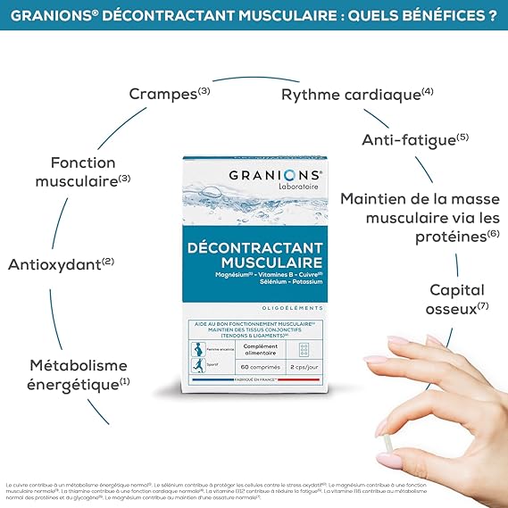 - BIEN ETRE | En plus de soulager les douleurs musculaires, le décontractant musculaire Granions favorise le bien etre général. Il contient des vitamines essentielles (Vitamine B), du Magnésium, du Selenium pour soutenir la santé globale. Peut être utilisé au cours de la grossesse, chez les sportifs, les adolescents et les personnes âgées