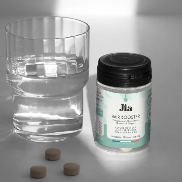 Le complément alimentaire cheveux Hair Booster (Force & pousse) de Jia Paris est un concentré de minéraux, vitamines et levure de bière inactive, formulé pour renforcer la fibre capillaire et stimuler une pousse saine et durable.