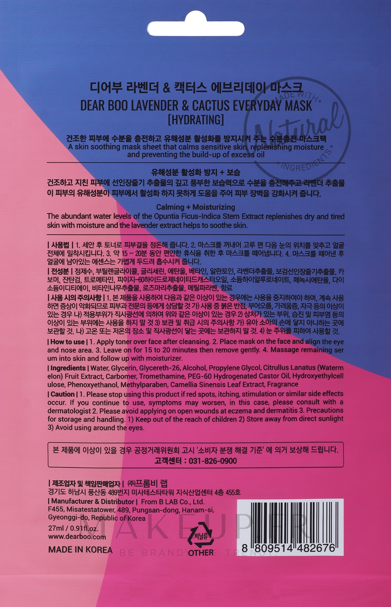 Toujours pertinent, élégant et moderne. Oui, nous parlons de la marque Dearboo, qui incarne parfaitement les meilleures traditions des cosmétiques coréens et représente fièrement son pays sur la scène internationale. Sous cette marque, vous découvrirez des produits de soin de la peau capables d’intriguer même les consommateurs les plus exigeants. Si vous accordez de l’importance au caractère naturel des masques utilisés pour le soin du visage, riches en substances vitales, alors Lavendero & Cactus de la série Everyday Mask est votre choix !