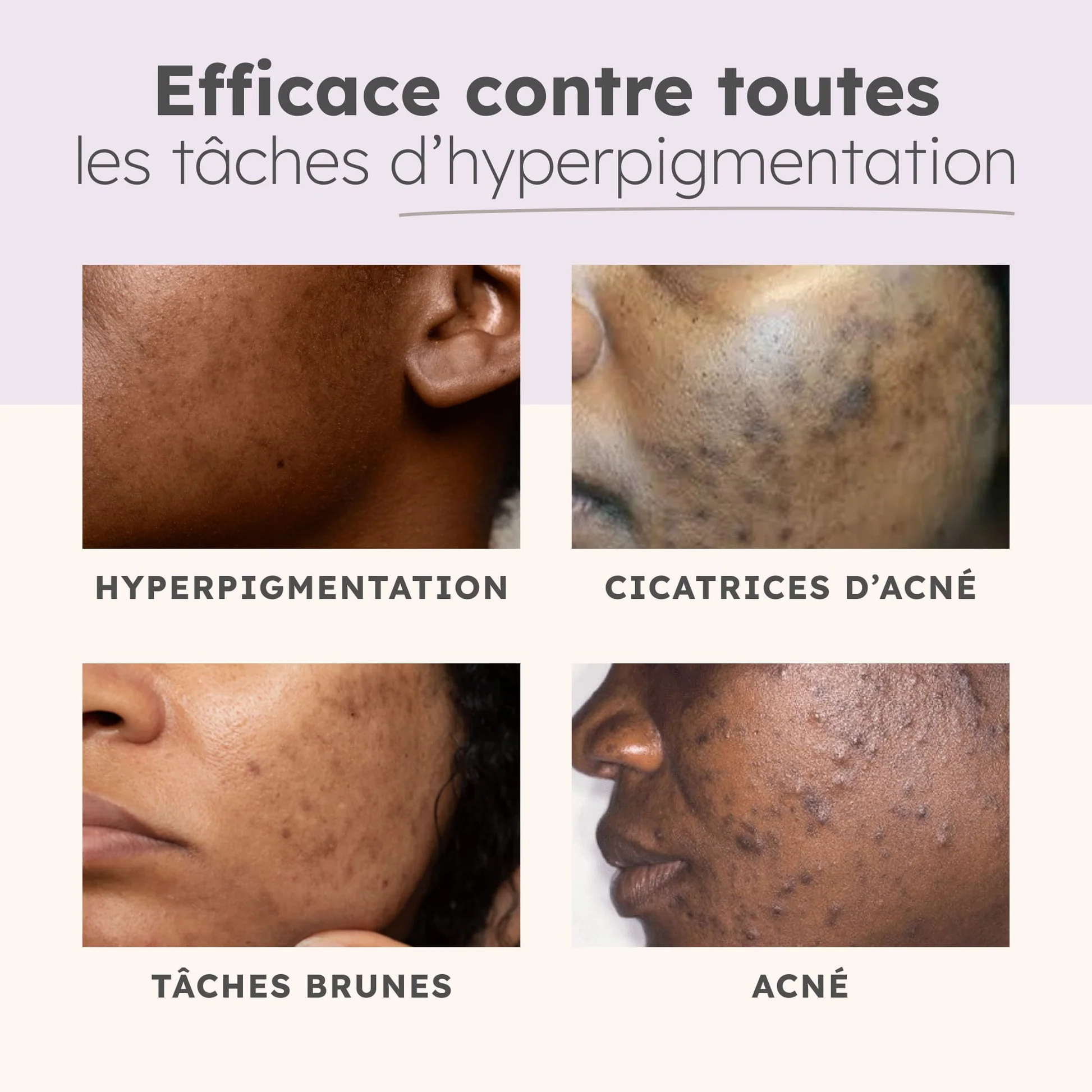 - Estompe l’ hyperpigmentation , les tâches brunes , l’acné et les cicatrices d’acné